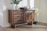 Designed with everyday living in mind, the sideboard offers ample storage: three spacious drawers on the left keep flatware, napkins, or small serving pieces organized, while the two-door cabinet on the right hides larger items like platters or linens. The clean, straightforward layout balances form and function, ensuring it fits seamlessly into both casual kitchens and more formal dining rooms.