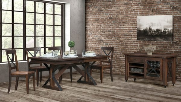 Provide ample storage for all of your dinner party essentials, keeping what you need for your next social event close at hand. The black metal X-shape appears on the table legs, the back of the chairs, and as a detail on the front of the matching server, tying the whole Wellington Reclaimed Barnwood Dining Set together beautifully.