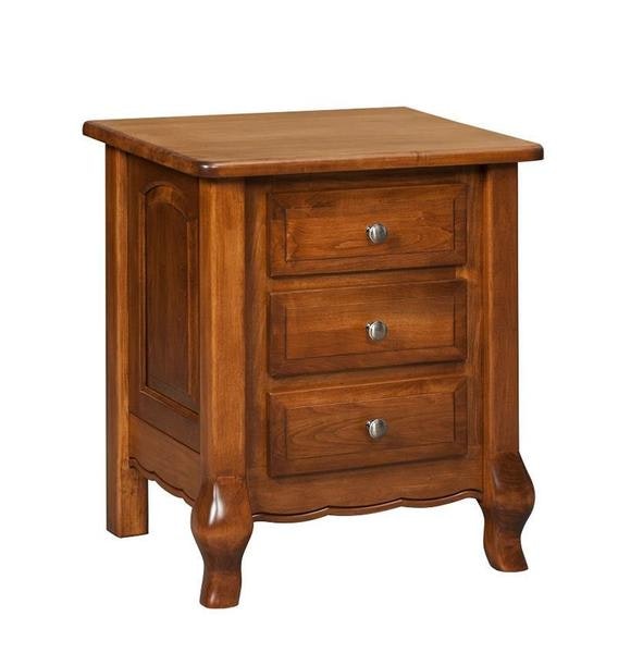 This French Country style Nightstand is shown here in brown maple wood with Amber stain. Brown maple wood displays a dark stain gracefully, polishes handsomely and looks magnificent in chocolate and cherry tones.