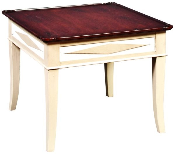 What sets this table apart is its striking contrast and attention to detail. The rich, warm tones of the cherry top provide a smooth, inviting surface—ideal for displaying a favorite lamp, a stack of books, or a small potted plant—while the lighter-hued base adds a fresh, airy balance. The apron features subtle geometric inlays that add a touch of visual interest without overwhelming, creating a look that feels both classic and gently contemporary. Below, the legs are slender and gracefully curved, tapering slightly to the floor for a light, elegant stance that keeps the piece from feeling bulky.