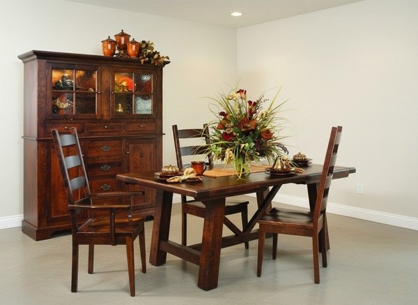 The Amish Williamsburg 5-Piece Dining Set becomes the heart of your home, where everyday meals and special gatherings alike feel warm and intentional. At its core is a dining table crafted to anchor your space, featuring a substantial 2-inch thick top that exudes both durability and understated luxury—perfect for everything from morning coffee to holiday feasts. Its trestle base, with clean, sturdy lines, offers reliable stability while adding a touch of classic charm, blending seamlessly with traditional or transitional decor.