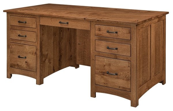 Build the executive desk you've been dreaming of. The Woodcreek measures 66" wide, 28" deep and 30" high. Enjoy a pencil drawer and file drawers to organize items. The Woodcreek is shown here in rustic quarter sawn white oak wood with almond stain. Have it built as you see it here, or explore other wood types and stain colors to customize. This desk is offered in a variety of wood types and stain colors. Rustic woods are also offered.