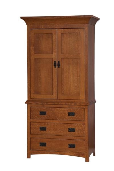 Enhance any bedroom suite with the addition of our Amish Woodland Mission Three Drawer Armoire. This solid wood bedroom storage piece has three drawers and two doors that will open up to ample storage space in your bedroom.
