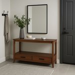 This wood sofa table measures 29.25" high, 54" wide and 16" deep. There are two drawers to help store items. The long lower shelf adds additional display space.