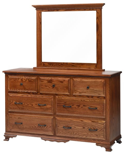 The Amish American Made Harriette Dresser with an Optional Mirror makes a beautiful display in your master bedroom or guest bedroom. This solid wood bedroom dresser offers seven spacious drawers to hold all your foldable clothing items and treasured keepsakes.