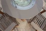 This round poly fire dining table is backed by a 10 year residential use warranty. For more information on the warranty, please read through the warranty link in the Specifications section below. For more information, contact our furniture specialist at 941-867-2233.