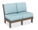 An armless loveseat is perfect for setting next to a wall outdoors. The armless feature provides a modern style that is becoming more and more popular. Premium poly lumber and industry standard Sunbrella fabric is used to build this luxurious outdoor loveseat. Best of all, this poly loveseat is backed by a 20 year residential warranty, giving you plenty of peace of mind.