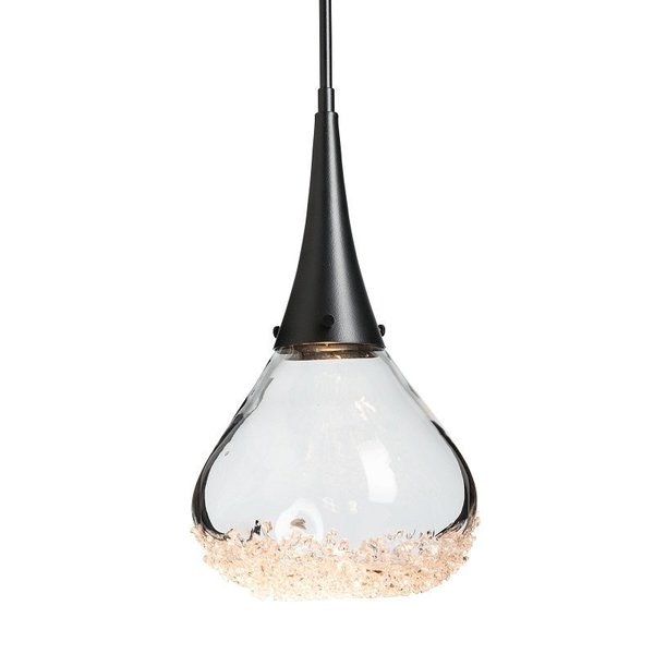 The design shines in its balanced contrasts: a teardrop-shaped glass shade, with a delicate, textured bottom edge that catches and softens light, creating a gentle ambiance. Above, a sleek, conical hammered steel top adds a tactile, handcrafted element—subtle ridges from the hammering process give it depth, a quiet nod to the skill of the artisans who shaped it. This combination of smooth glass and textured metal feels both refined and approachable, making it versatile enough to complement minimalist kitchens, cozy living rooms, or even a home office in need of a focal point.