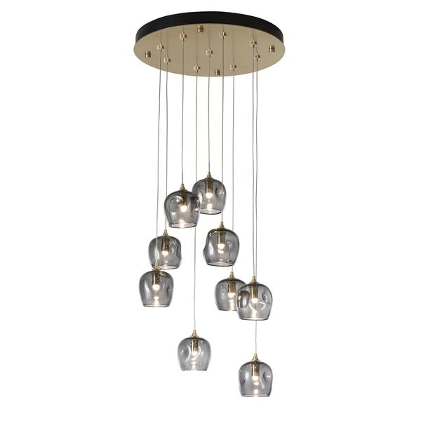 This modern 9-light cluster suspension pendant is available in various glass choices, from grey to clear to frosted. The fixture and canopy faceplate also has many finish options available but the upper canopy will always be a black finish. The 9 thumbprint pendants are low voltage and are hanging from a single canopy. You can also customize the length of this pendant to fit your space. You can use this pendant with sloped ceilings as it is adjustable to 45 degrees. This pendant light is handcrafted in the USA and comes with a limited lifetime warranty.