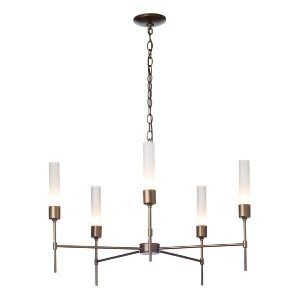 The American Made Vela Chandelier alludes to classic designs of the 17th and 18th century, but with a clean modern spin. The Vela boasts five slick hammered steel arms framed with tall cylindrical glass tubes. Choose between clear or frosted glass and select from 12 hammered steel finished to create your perfect in-home lighting.