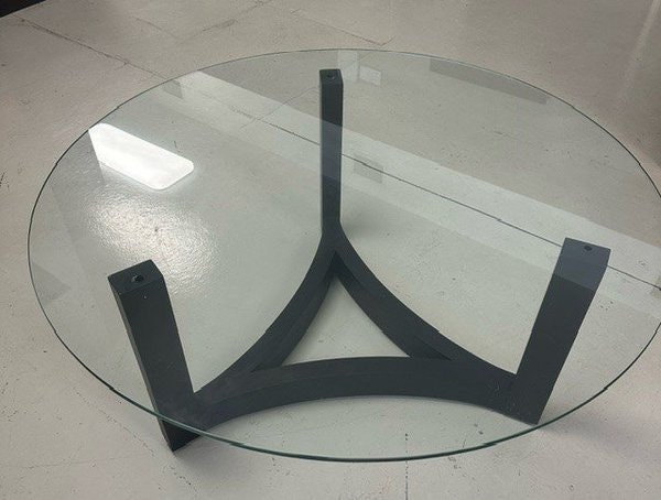 This Amish handcrafted round glass top coffee table has a beautiful solid maple wood base with curves and three post legs. It is ready to ship with wood, and the finish and other options have been determined. Please see the quick specs for details. As an in-stock product, this is a final sale and does not qualify for return.