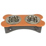 The elevated style is good for your pet's neck and back. Comes with two stainless steel bowls.